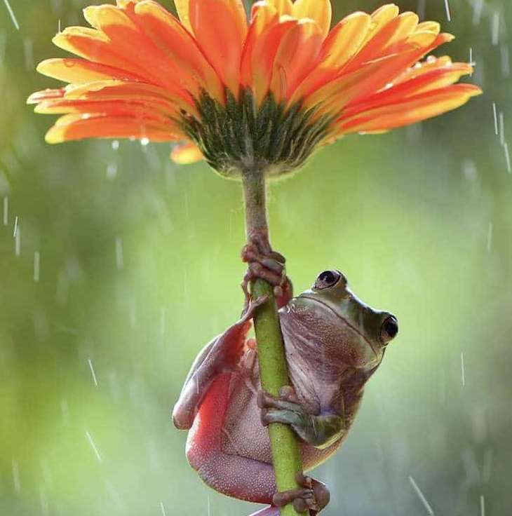 A frog takes refuge under a flower. With the rainstorms seeming to come from nowhere, it is hardly surprising. The Common Frog native to UK, spawns anytime between December and April. and those little tadpoles only take fourteen weeks to become cute little hopping froglets. He lives five – ten years, quite a span, and can be seen throughout the country in UK, and frequently takes up residence in our garden ponds, but don’t take away those garden snails and slugs, his main food source, or he will be hopping mad!