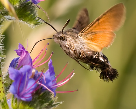 He is actually a day flyer and he vibrates and apparently sounds much like a hummingbird, beating his wings at 70 times per second compared with his rival Hummingbird, beating at 80 times per second.