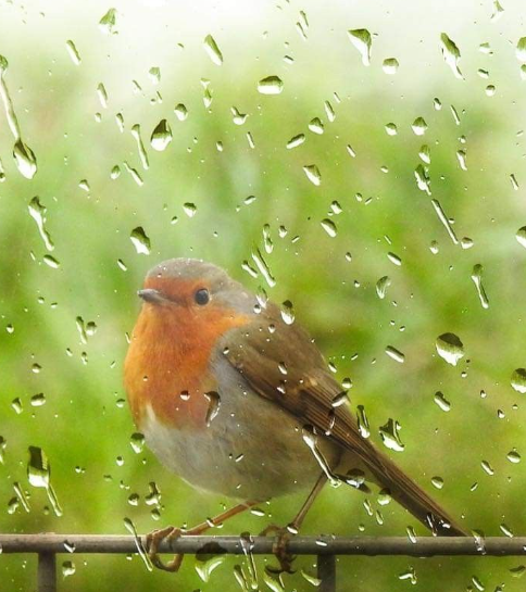 Just when you thought there couldn’t possibly be any more rain in these parts, the skies become dark and the rain begins again. The weather has been flip flopping from bright blue skies interspersed with clouds and chilly crisp temps, to downpours upon downpours. One of my robins in the garden is, as is all nature, just taking it in his stride and appears with the brighter spells.