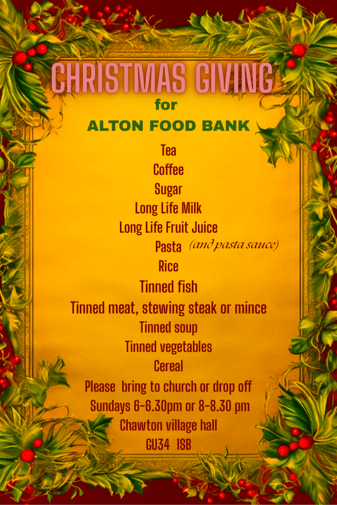 Don’t forget we are collecting for Alton Food Bank. Anything that you can give will be appreciated.